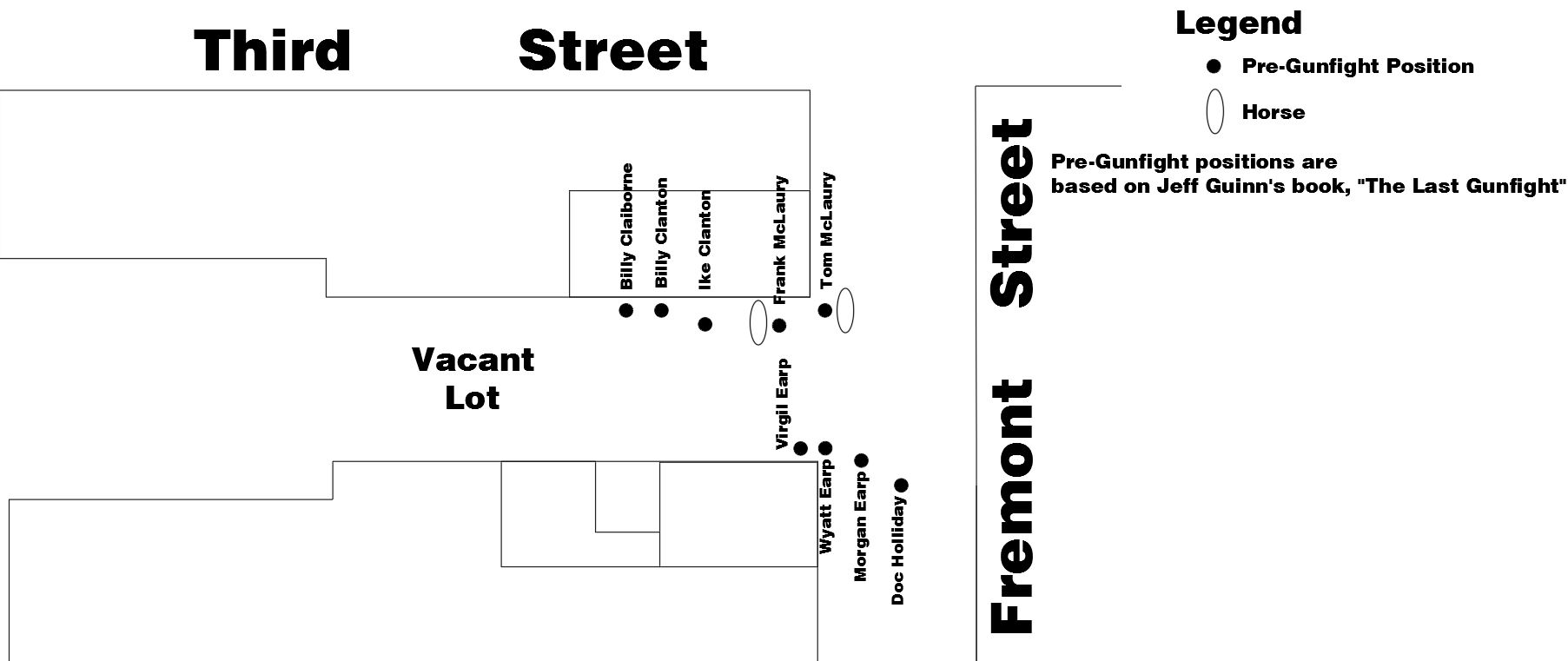 Virgil Earp stepped just inside the lot, while brother, Wyatt remained on his right side, at the northwest corner of Fly’s Boardinghouse. Morgan Earp was positioned to Wyatt’s right, a few feet further back, while Doc Holliday was basically in the middle of Fremont Street, keeping his eyes out for other cowboys nearby. The cowboys were lined up on the opposite side of the vacant lot near the Harwood house.