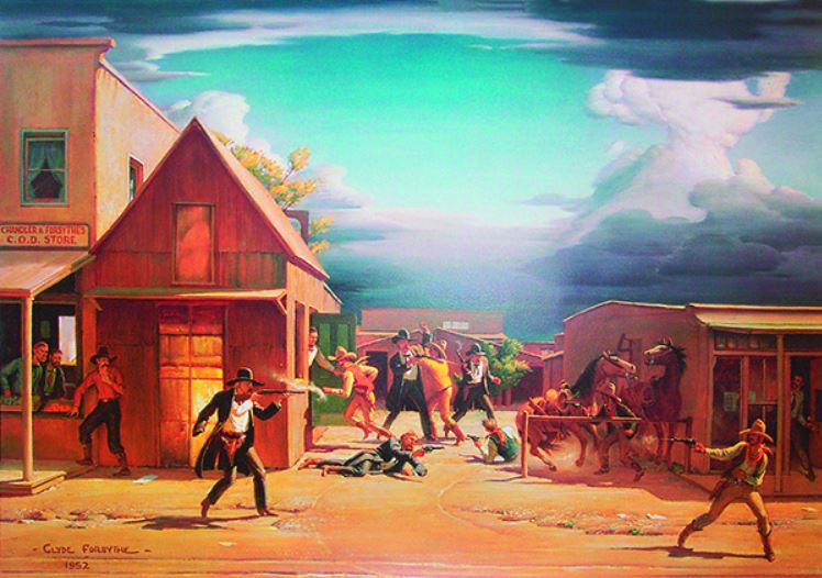 In mid-2010, historian, author and antique dealer, Lee Silva came across and purchased a collection of paintings, drawings, letters and personal belongings of many of the early cowboy desert painters including Victor Clyde Forsythe, John Hilton, Bill Bender, James Swinnerton, Ted DeGrazia, Will James, Ed Borein and Olaf Wieghorst. Amongst the collection, was an original, signed pen-and-ink sketch by Victor Clyde Forsythe that was the drafted rendition of the well-known 1952, 43″x 60″ oil painting by the same artist of the gunfight near the O.K. Corral.