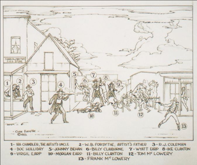 This unique sketch identifies each person that was illustrated in the final painting. This sketch, which may be the only one known to exist, is based upon eye-witness accounts, and accounts handed down by Victor’s father, William Bowen Forsyth and Victor’s uncle, Ira Chandler, who ran the Chandler & Forsyth C.O.D. Store, located at 328 Fremont Street. Both claimed their presence at the gunfight, and were said to have kept a journal that they recorded in what they had witnessed. There are discrepancies though from what was illustrated and other eye-witness testimonies from other Tombstone citizens and the Earp entourage.