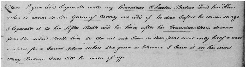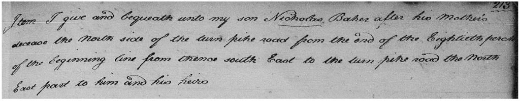 There are two branches of my family tree that harken back to Maryland. The one branch is my Earp family on my maternal side, and the other branch is my Tolbert (Talbot) family on my paternal side. A few years ago, I was researching an associated family through my Earp branch, which is the Baker family. My 5x great-grandmother, Ruth (Baker) Timanus, was born in 1785 in Baltimore Co., MD and died in 1849 in Van Buren Co., IA. The earliest mention of Ruth’s name is in her grandfather’s will, dated 20 Sept. 1795, and proved 11 Sept. 1799. Her grandfather was Nicholas Baker. Nicholas Baker and his wife Mary, at the time that this will was written had nine children, eight daughters and one son. They also had two grandchildren. Daughters Rachel Hamilton, Sarah Rowles, Rebecca Randal, Elizabeth Hamilton, and Susannah Hamilton (as their names were written in the will):