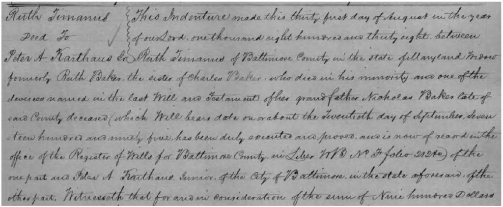 There are times that you may be lucky enough just to see this amount of information relating to one of your ancestor’s families, but I had even more luck on my side. I was then able to find this indenture relating to Ruth (Baker) Timanus that took place in Baltimore Co. in 1838. (Note: An indenture is a legally binding contract between two parties, with this type of indenture being a land transaction):