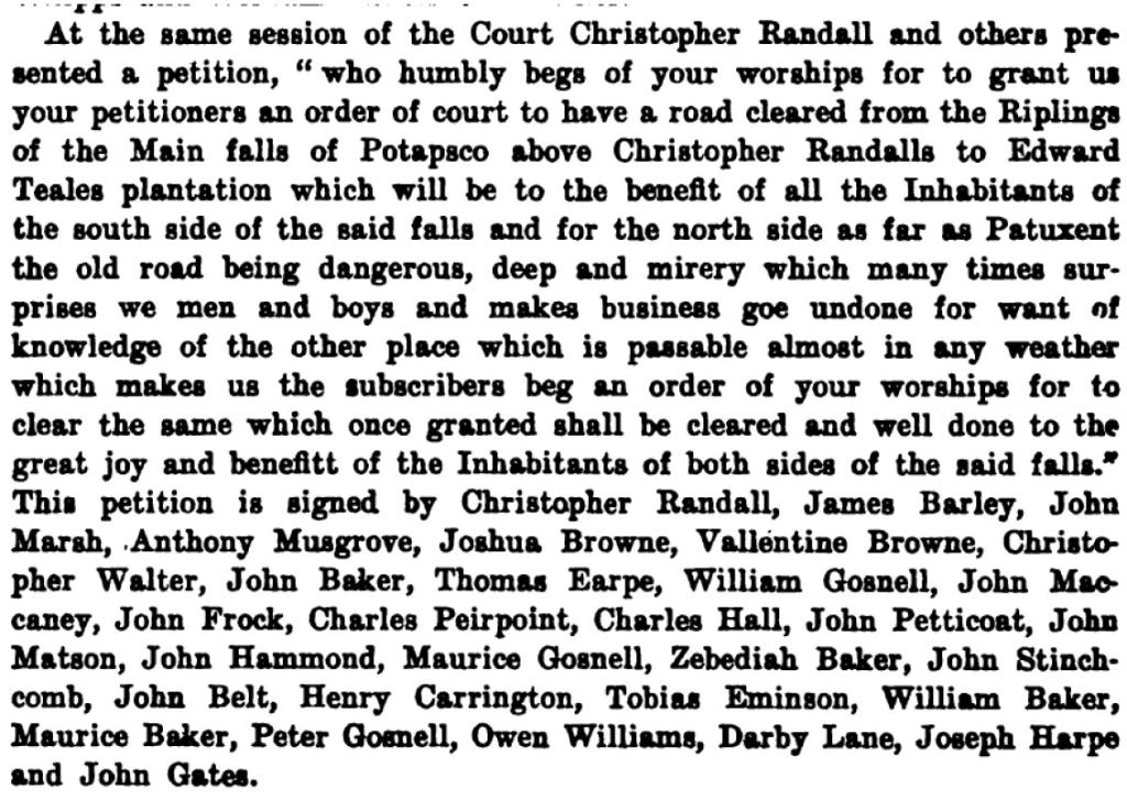 The name of Edward Teale appears, another direct ancestor of mine through the same family (Edward Teale was married to Hannah Randall, daughter of Christopher Randall). As I read further down through the list of petitioners, I could hardly believe my eyes. Besides the Randall name, there is Thomas Earpe (direct ancestor), Maurice Baker (direct ancestor, father of Nicholas Baker), and Joseph Harpe (ancestral cousin, Harpe is a variation on the name Earpe).