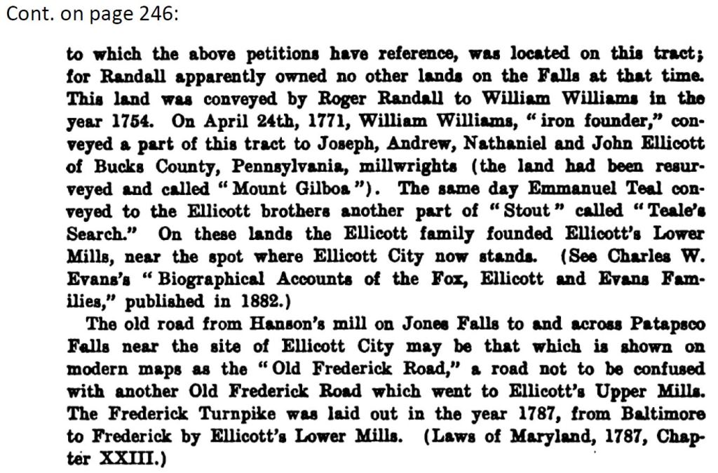 With the appearance of the Ellicott brothers in 1771, and the conveyance of ancestral lands of my family to them, it appears that Ellicott City now has a little more meaning for me. My Clements family and Earp family came to know the Ellicott brothers and their offspring by having lived near them and worked in their forges until the great flood of Baltimore in 1868.