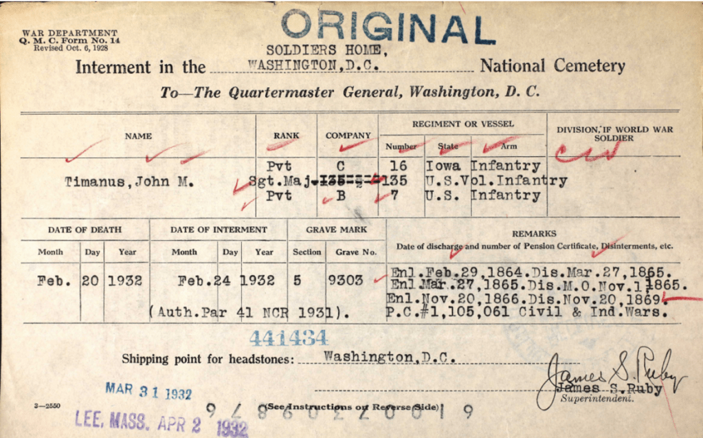 On the 20th of Feb., 1932, John M. Timanus passed away and was buried in the U.S. Soldiers’ and Airmens’ Home National Cemetery in Washington, D.C.