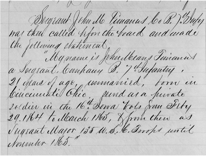 “My name is John Means Timanus, a Sergeant, Company B., 7th Infantry. 21 years of age, unmarried, born in Cincinnati, Ohio. served as a private soldier in the 16th Iowa Vols. from Feb. 29, 1864 to March 1865, & from then as Sergeant Major, 135 U.S.C. Troops until November 1865.”