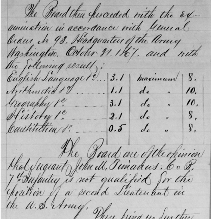 “The Board are of the opinion that Sergeant John M. Timanus, Co. B. 7th Infantry is not qualified for the position of second Lieutenant in the U.S. Army.”