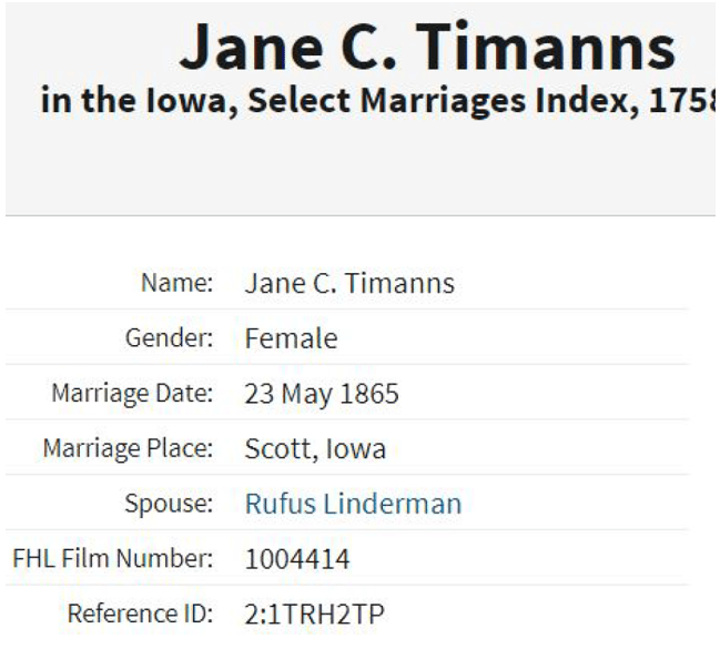 I then found the marriage record of 23 May, 1865 for Jane C. Timanns and a Rufus Linderman:
