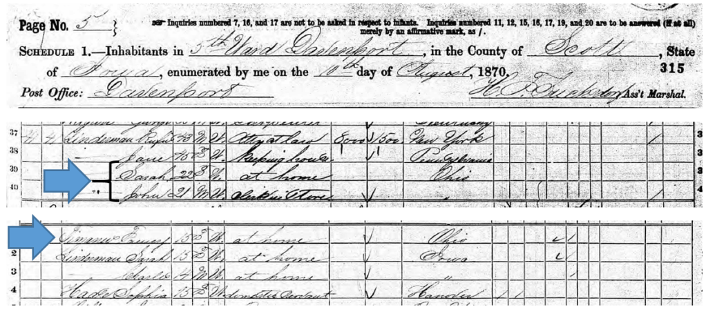 It appears everybody is accounted for…Sara(h) is there, says born in Ohio, and John, also born in Ohio, and for some odd reason, Fannie is listed with the Timanus surname, also born in Ohio. The other Linderman children are the children of Rufus Linderman from his previous marriage.