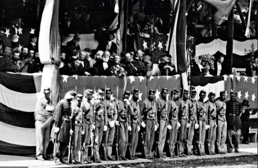 May 23-24, 1865 – The 135th United States Colored Troop Regiment, marched with General William T. Sherman’s Army, in the Grand Review at Washington DC, on May 24th, 1865. They tell the story in their pension records that they not only marched in the Grand review but marched past the President of the United States under their own Regimental Flag ( you can see from left to right, General Ulysses S. Grant leaning forward in the front row of the grandstand, after which is Sec. of War Edwin Stanton behind General Grant facing President Andrew Johnson, then Sec. of the Navy Gideon Welles, unidentified person, General William Sherman, Maj. Gen. William Rosecrans, unidentified person and General George Meade). Sgt. Major John M. Timanus was more than likely present at and participated in this historic event.