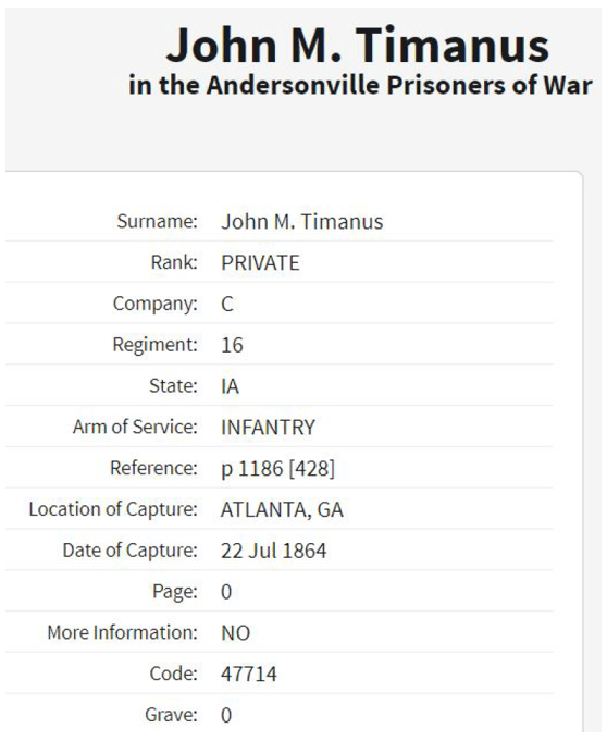 John M. Timanus survived being a prisoner of war at the Andersonville prisoner of war camp in Georgia. Anyone that has done research on the Civil War knows about the atrocities that happened there, and for an 18-19 year old soldier, it must have been unfathomable to comprehend what he was going through and how he felt, just as the many other soldiers that were held there: