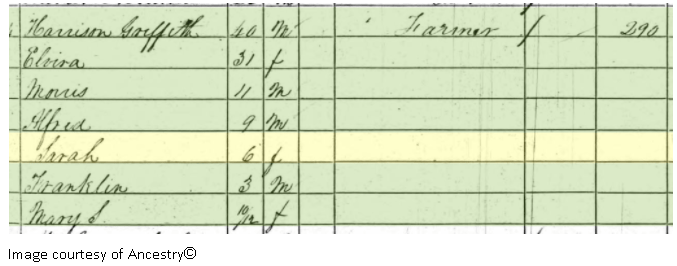 At this point, we can only deduce that Sarah died sometime between 1880 and 1900. By 1900, Sarah’s husband is remarried. We will be able to narrow down the time frame of when Sarah passed away and the reason for this will be clear in discussing our next disappearing act.