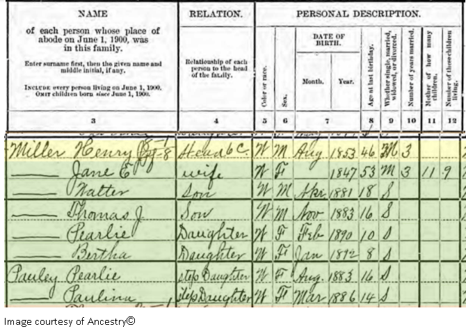 There is a lot of information we can glean from this census. We can see that Henry and his new wife Jane E. Humphreys have been married for 3 years, placing their marriage year in 1897. We can also deduce from the youngest child that was born in 1892 to Henry and Sarah, that we now have a 5 year time frame in which Sarah passed away. Notice the 2 Pauley step-daughters. They are the children of Jane E. Humphreys and Enos Pauley, Jane’s first husband. Remember that Henry’s mother was Mary Pauley…Henry and Enos were 2nd to 3rd cousins.