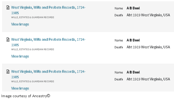 After using some different search techniques and thinking outside the box, I decided to go simple and just use Andrew’s first initials, A.B. and lo and behold, I was given a few nuggets of information we didn’t have before. I got these three hits on Ancestry: