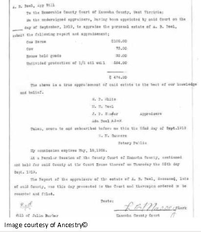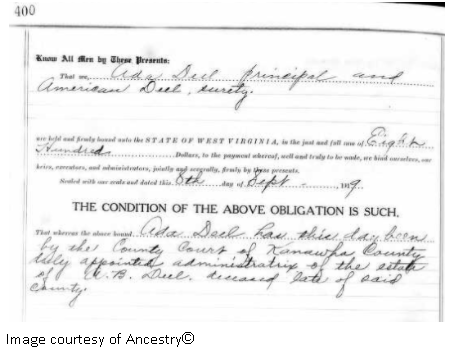 The 1st record shows Ada, Andrew’s wife being appointed Administratrix and Ada’s mother, America Deel, Surety, dated 8 Sept. 1919:
