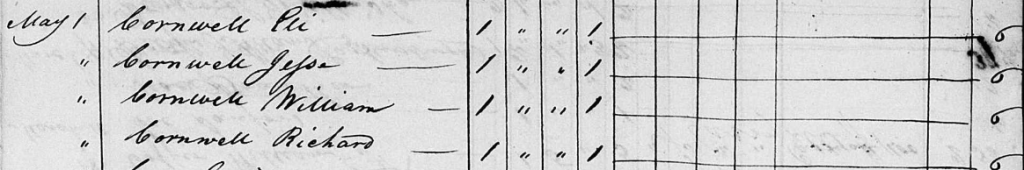 Once I got into a rhythm of going through these images, I got to the 1818 taxation year and found my first instance of a Cornell family. Richard Cornell and William Cornell-May 26th: