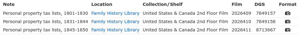 FamilySearch Catalog – Personal property tax lists, 1801-1850