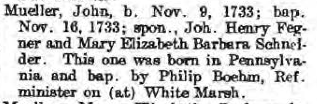 Notice the remark “…and bap. by Philip Boehm, Ref. minister on (at) White Marsh”? That means my John Miller wasn’t actually baptized at the Tulpehocken Church, which I already knew. Rev. Stoever simply recorded the birth and baptism record for my John Miller.