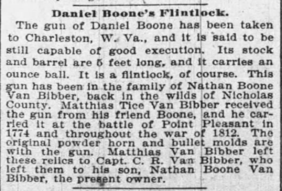Moving on to Matthias Van Bibber…I wanted to touch on an artifact that was supposedly given to Matthias by Daniel Boone.  Daniel Boone’s rifle.  There are a lot of stories floating around the internet regarding this topic.  Rather than dive in head first trying to address those, I did a search on Newspapers.com and came up with the following: