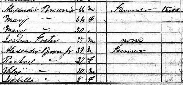 1860 Census, Nicholas County, VA – Alexander and Rachel Brown and family (Isabella, daughter married Wm. Alexander Morris). Notice they are living next door to Alexander and Mary Polly Brown:
