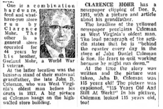 I noticed the one daughter mentioned as Mrs. M.S. Mohr. This is probably the mother of Garland and Clarence Mohr mentioned in the second article of 15 Nov 1968. So far so good. We definitely have the right John D. Coleman.