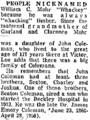 According to the second article from 15 Nov 1968, John Coleman’s brothers were Joshua, Seaton and Charley. If this is correct, then the Joshua Coleman that is mentioned is my wife’s 3x great-grandfather.