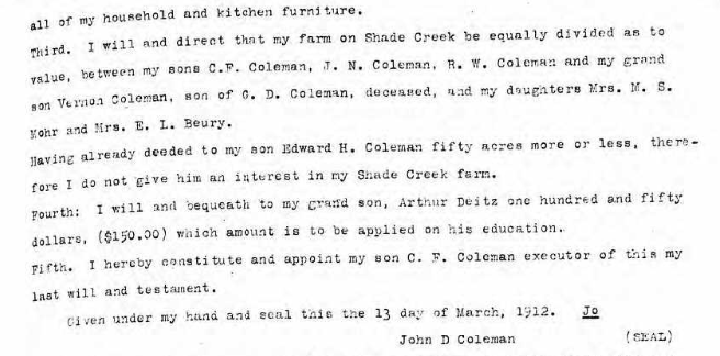 I began a search on Ancestry (FamilySearch works just as well) for a John D. Coleman with a death date of 1917 and I found John Coleman’s will: