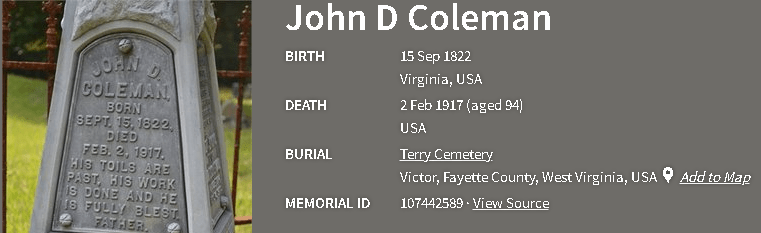 I then found John Coleman’s Find a Grave memorial page and here is the first sign of a birth date which now contradicts the old age attributed to John in the newspaper articles (not that 94 isn’t old, just not 117 years old):