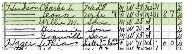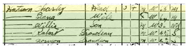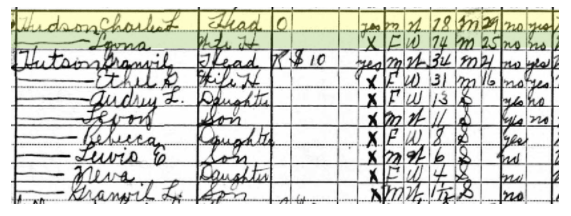 Let’s look at the censuses going back beginning with the most recent and going back chronologically. We’ll start with the 1930 Census for Washington Dist., Lincoln County, WV for Charles L. Hudson: