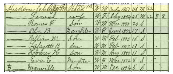 At the top is Charles and his wife Leona. Living next door is their son Granville. Note some of the names of Granville’s children like Lewis and Rebecca. Naming children after other older relatives was a common occurrence in the past.