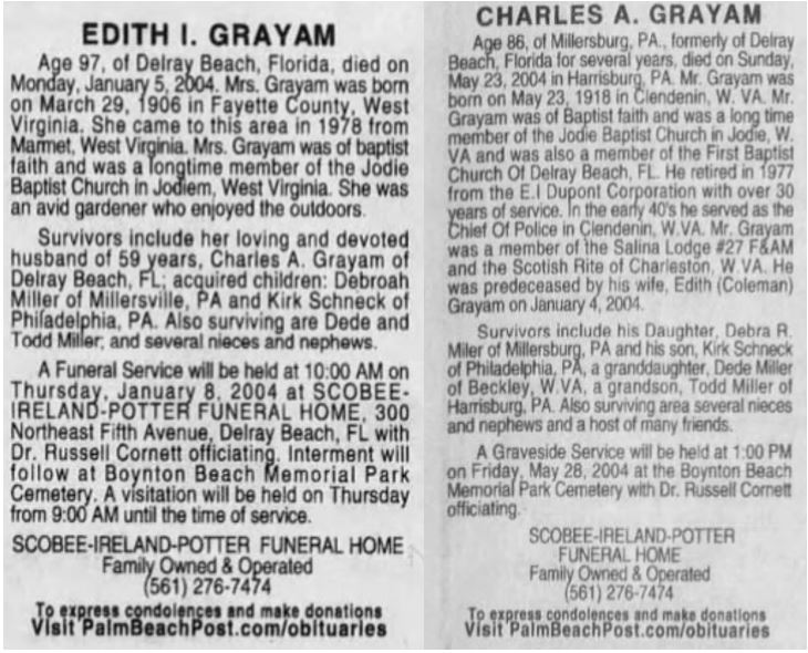 I found her obituary in The Palm Beach Post, 07 Jan. 2004, as well as Charles Grayam’s obituary for 27 May 2004: