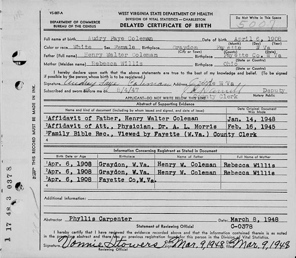 I did a search on the West Virginia Department of Arts, Culture and History Births web page and sure enough here is Audry and her twin brother Andy with the same birth date: