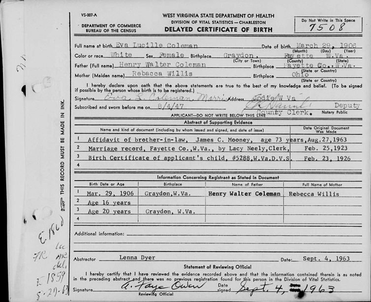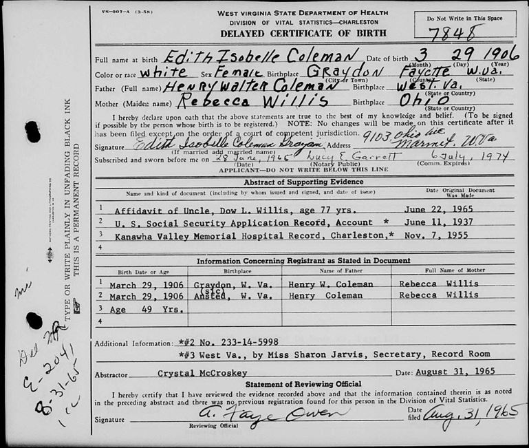 My wife’s maternal grandmother, Eva Lucille Coleman, was born on 29 March 1906 in Graydon, Fayette Co., WV to Henry Walter Coleman (1875-1948) and Rebecca Willis (1876-1963). Eva was born a twin, but not identical. Throughout the family, Eva’s twin was known as Ada. Cheryl’s mother called her “Aunt Edie”. It was also known that there was a rift between Eva and Ada but as with most of these types of family matters, they are personal.