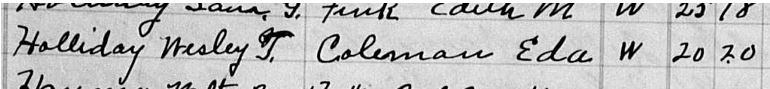 15 April, 1926 Marriage Record for Eda Coleman and Wesley Holliday: