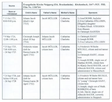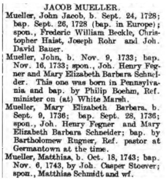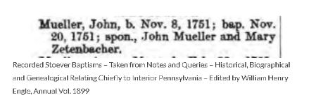 The record of Johan Jacob Mueller’s birth and baptism was confirmed by the Rev. Jacob Stoever’s records, along with Jacob’s siblings: