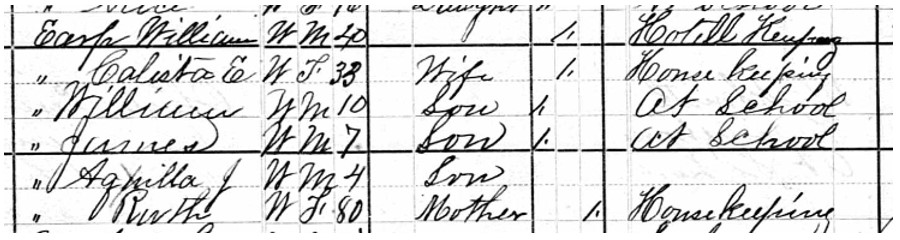 Here is the 1880 Census in Wharton, Wyandot Co., OH for William Earp Jr., his wife Calista Ward and their children and William’s mother, Ruth: