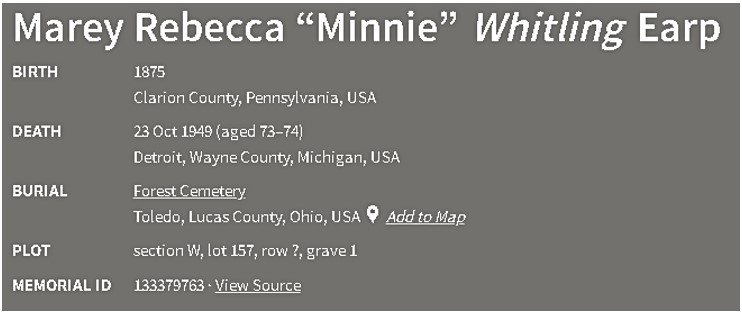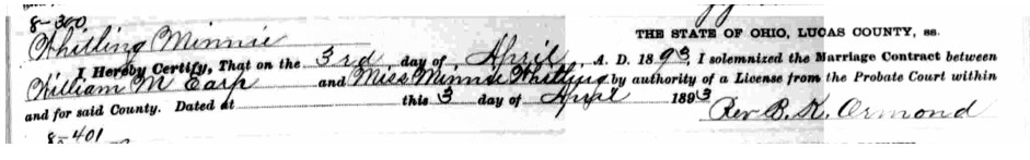 Here is the marriage record from 1893 in Lucas Co., OH for William M. Earp (son of William Earp and Calista Ward) and Marey “Minnie” Rebecca Whitling: