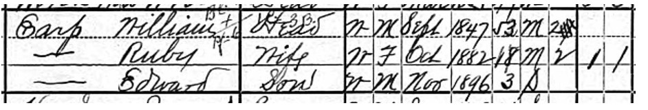 Under occupation, it is stated that William Earp was a banker. As you can see, he is 53 years old, and his wife Ruby is 18 and they have a son Edward that is 3 years old. As the old “genie” adage goes “Tell, don’t dwell”. Just stating the facts as they are shown through the records. I believe the William Earp that is stated in this census, was the son of Joshua Earp, whom we saw earlier. I have found no other record or census for this William Earp, Ruby his wife or their child shown above. I believe more extensive research needs to be done.