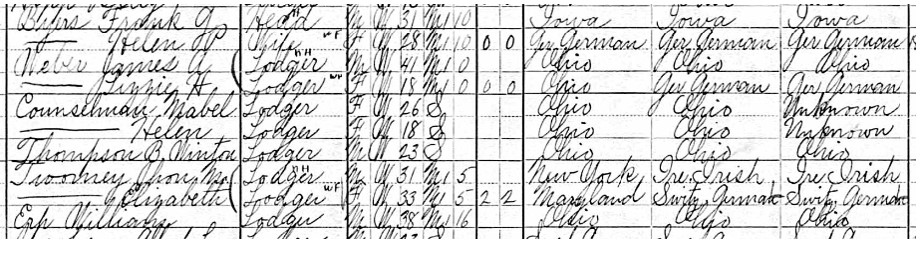 I then went searching for William Earp (son of William Earp, Jr. and Calista Ward) living in Toledo, Ohio that married Minnie Whitling based on the 1893 marriage record mentioned above (Minnie’s full name was Marey Rebecca Whitling, daughter of William H. Whitling and Susan Sipler of Clarion Co., PA). I did not find William and Minnie in the 1900 census for whatever reason, but I did find William in the 1910 census, in Toledo, Ohio, and he is a lodger, a cigar salesman and Minnie is not with him, although it states he’s married and has been for 16 years. I did not find Minnie anywhere in the 1910 census, so I am not sure why they were separated: