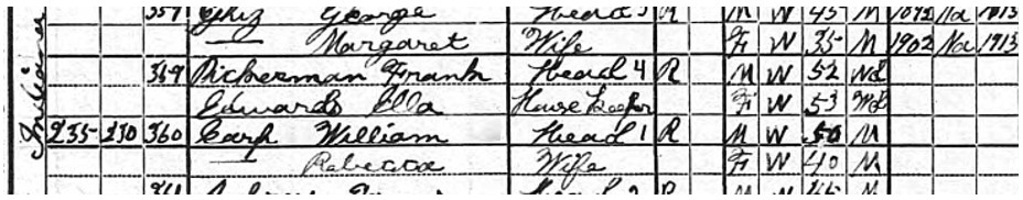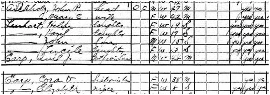 Here’s the 1920 census, taken in Jan. of 1920 in Hancock Co., OH for Aquilla Earp and his family living with his brother-in-law: