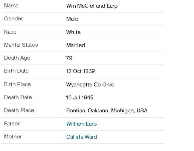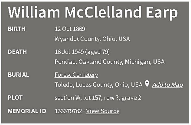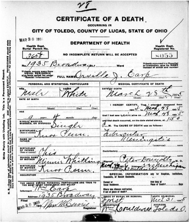 Aquilla Earp (1875-1920) – Aquilla lived at 235 Indiana Avenue in Toledo, OH between 1910 and 1920 as per his WWI Draft Registration card. It also stated on the back of the card that Aquilla was confined to a wheelchair due to rheumatism. He passed away in Feb. of 1920 in Hancock Co., OH.