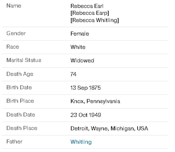 As I searched further for William and Rebecca Earp, it’s as if they fell off the face of the earth. I found no 1930 or 1940 census for either one of them anywhere in the United States. I am not surprised though since I have seen this occur before when researching other ancestors.