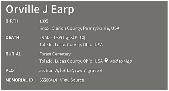 Unbeknownst to me until I found Rebecca’s memorial page, it appears that William and Rebecca had a son named Orville J. Earp, born in 1895 in Knox, Clarion Co., PA. I did not find William and Rebecca and their son living in Knox, PA in 1900, since Orville is recorded as being born there. It is possible that they were visiting relatives or for some other reason that they were not counted in the 1900 census. Orville died in 1905 in Toledo, Ohio from Tubercular Menangitis: