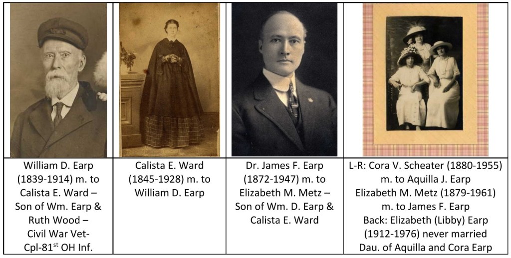 James Earp (1872-1947) – James became a physician and lived in Toledo, OH during the 30’s and 40’s. He later passed away in Henry Co., OH.