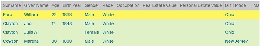 There was also a younger William Earp living in Wyandot Co., OH at the time. Again, the 1860 Census for this county was very hard to read, so here is the transcription index: