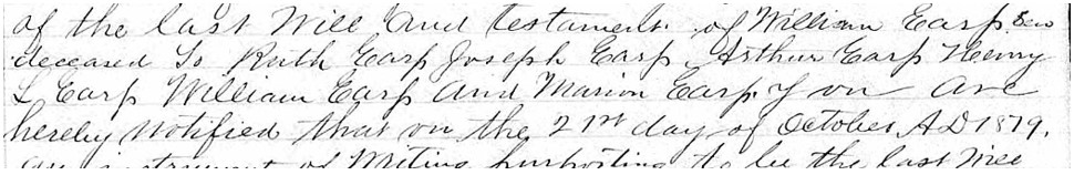 William Earp, Sr., born in 1793 in Frederick, MD and married Ruth Wood in 1821 in Baltimore, moved to Wyandot Co., OH. William Earp, Sr. died in Wyandot Co., OH in 1878 and his will was probated 28 Oct. 1879. William’s wife, Ruth, 2 children and grandchildren were named as follows: