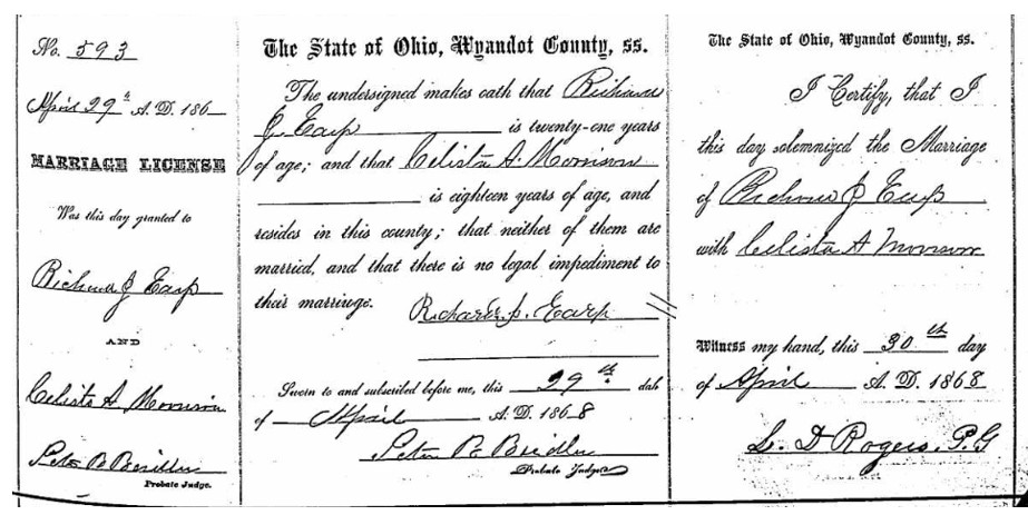 Peter Beidlers’ name shows up in other Earp records as well. The marriage record of William Earp Jr., who married in 1867 to Calista Ward in Wyandot Co., OH: