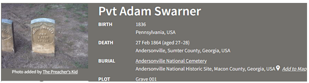 I found a man by the name of Adam Swarner (1836-1864) who was born in Pennsylvania and if records can prove it out, Adam would have been Henry Swarner’s grand-nephew. Adam Swarner was the son of John Swarner (1785-1864) and Rebecca Bixler (1800-1862). Adam’s grandfather was Adam Swarner (1765-1842), son of Johann Adam Swarner and Elisabetha Margaretha Demmler.