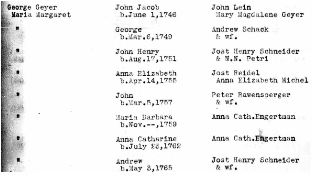Here are transcribed birth records I found for the Geyer family, which includes John Jacob, George and John and their other siblings: