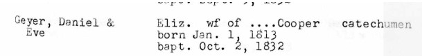 The next record I found was a translated record of a catechumen for Elizabeth (Geyer) Cooper, stating her parents as Daniel and Eve Geyer: