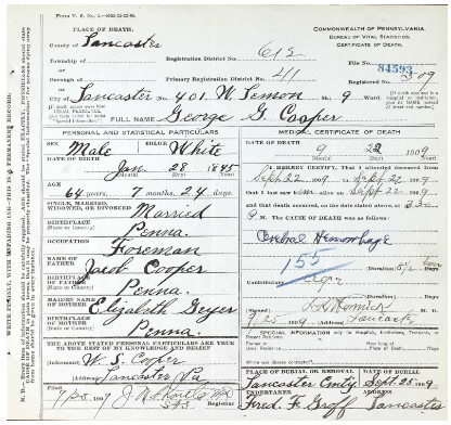 This first record I want to show is the death record of Samuel Cooper’s brother, George G. Cooper (1845-1909). Jacob Cooper and Elizabeth Geyer are listed as the parents: